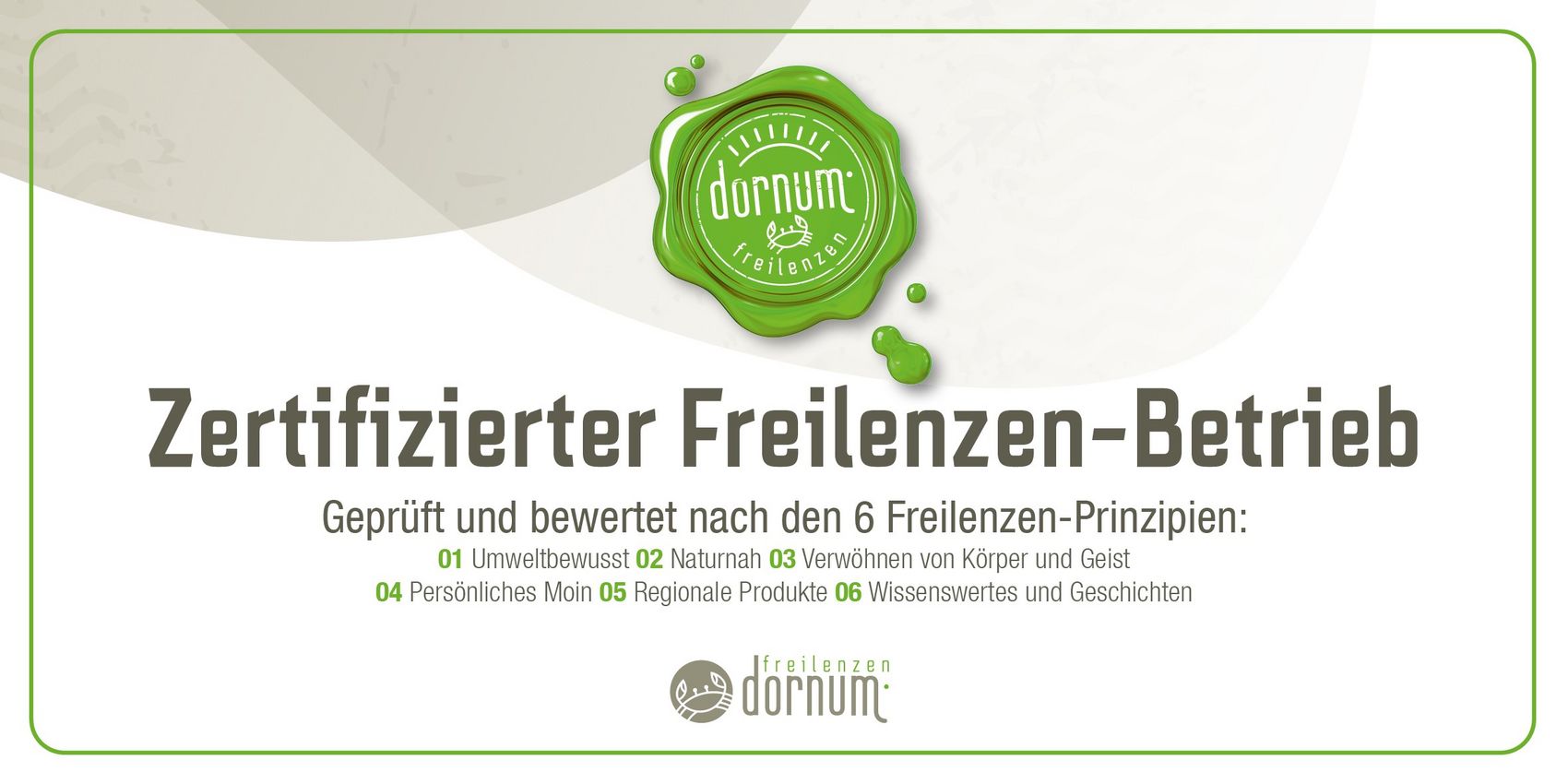 Wenn dich einzigartige Naturlandschaften faszinieren. Wenn du gerne mit Einheimischen in Kontakt kommst, dich für ihre Geschichte und Kultur interessierst und gerne essen gehst. Wenn du gerne mit dem Rad unterwegs bist. Wenn du Reisen in ruhigere Regionen, die weniger touristisch geprägt sind, bevorzugst, es dir aber trotzdem wichtig ist, dass Orte in der Nähe sind, die Sehenswürdigkeiten und kulturelle Angebote zu bieten haben. Wenn Entschleunigung und Erholung nicht zu kurz kommen dürfen, um Kraft zu sammeln und Zeit füreinander zu haben. Dann bist du ein echter Freilenzer und wirst dich in Dornum wohlfühlen. Denn Freilenzen kannst du nur in Dornum, den viele unserer Unterkünfte, Sehenswürdigkeiten, Events sind nach den 6 Freilenzen-Prinzipien zertifiziert.